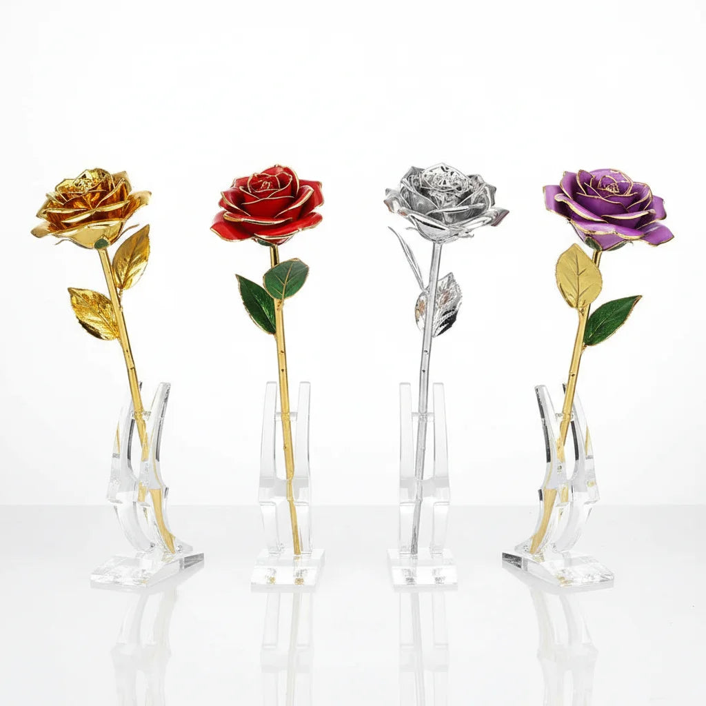 Absolutely. Each 24K gold-plated rose is accompanied by an elegant, clear display stand, designed to showcase its exquisite form. It ensures this cherished bloom can be admired from every angle, a constant reminder of enduring affection.